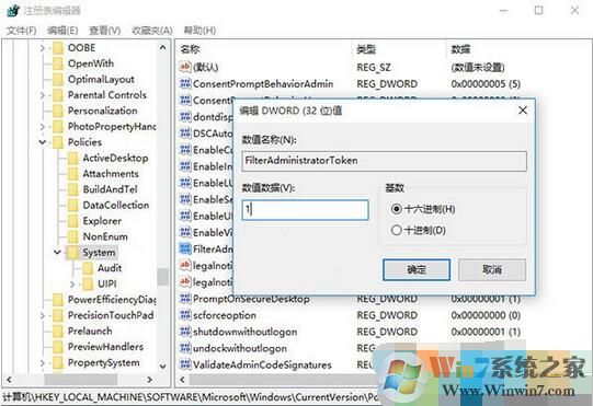3、在右邊找到FilterAdministratorToken,雙擊后將數(shù)值數(shù)據(jù)改為“1”后點(diǎn)擊“確定”
