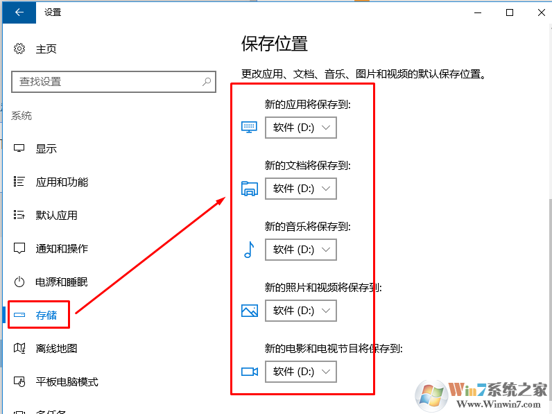2、點(diǎn)擊“存儲(chǔ)”,在右側(cè)“保存位置”下方把“新的應(yīng)用將保存到”下拉菜單修改為其他磁盤,比如“D盤”,然后點(diǎn)擊應(yīng)用即可。這里建議將所有的保存路勁修改為其他盤。