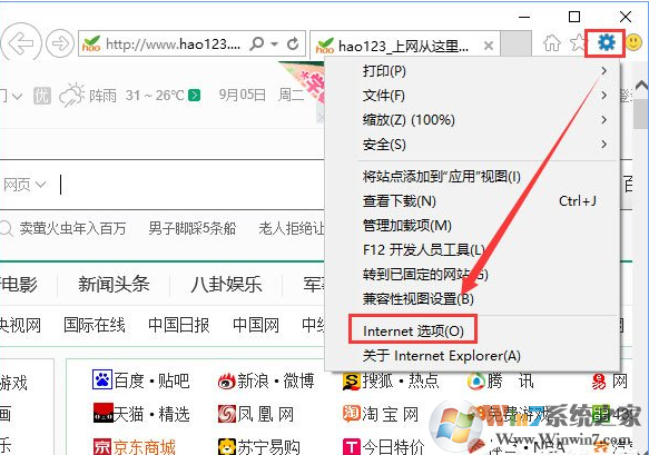 2、打開(kāi)ie瀏覽器后,點(diǎn)擊【工具】--【internet 選項(xiàng)】,如圖: