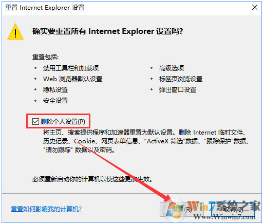 4、在重置internet Explorer 設(shè)置 框中勾選【刪除個(gè)人設(shè)置】,然后點(diǎn)擊重置。