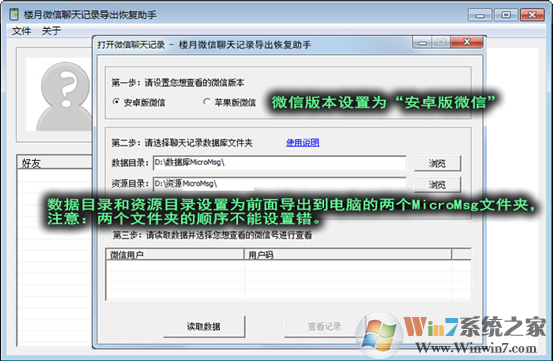 1、,安卓手機(jī)中每個(gè)登陸的微信號(hào)中的微信聊天記錄都經(jīng)過了嚴(yán)格的雙向加密,我們需要借助“樓月微信聊天記錄導(dǎo)出恢復(fù)助手”才可以解密查看里面的所有微信聊天內(nèi)容。打開該軟件后,按下圖進(jìn)行相應(yīng)設(shè)置。設(shè)置后點(diǎn)擊“讀取數(shù)據(jù)”按鈕,然后選擇一個(gè)想查看的微信號(hào)后點(diǎn)擊“查看記錄”按鈕。