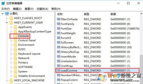 2、依次展開HKEY_CURRENT_USER\Console,在右側(cè)雙擊打開LoadConIme值,將其數(shù)值數(shù)據(jù)修改為“0” 點(diǎn)擊確定保存設(shè)置重啟計(jì)算機(jī)即可!