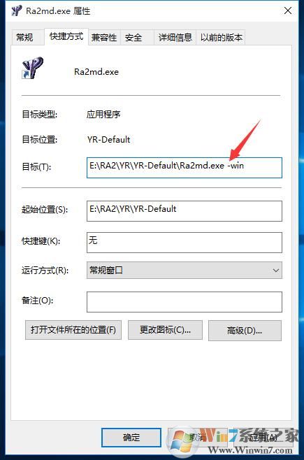3.先把YR改成窗口化運行。如紅箭頭所示,“目標(biāo)”編輯框中,在文件路徑的末尾添加“ -win”(不含雙引號,注意前面有一個空格)。