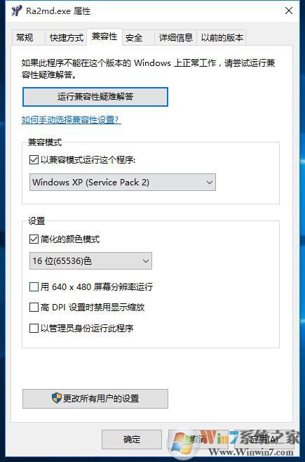 步驟:勾選“以兼容模式運行這個程序”,在下面的下拉框中選擇“Windows XP(Sevice Pack 2)”;勾選“簡化的顏色模式”,在下面的下拉框中選擇“16位(65536色)”。