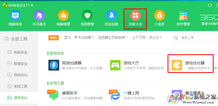 1、打開360安全衛(wèi)士---功能大全---游戲優(yōu)化器。