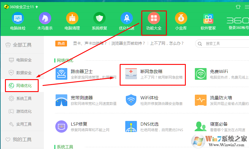 1、打開360安全衛(wèi)士---功能大全---網(wǎng)絡(luò)優(yōu)化---斷網(wǎng)急救箱。
