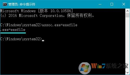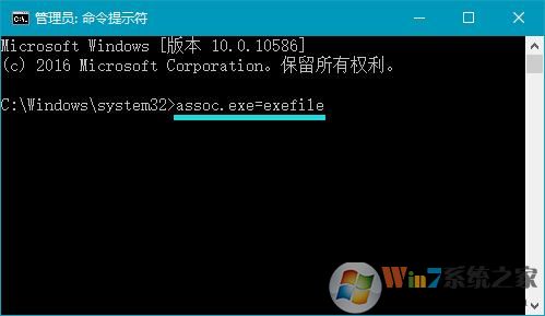 2、打開命令提示符窗口后,輸入assoc.exe=exefile命令,然后按回車,如圖所示: