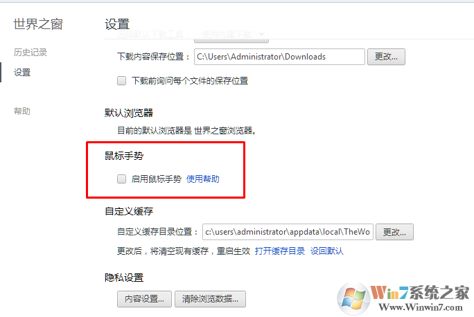 還有一個(gè)問題就是很多用戶表示找不到鼠標(biāo)手勢這一項(xiàng),其實(shí)不是沒有只是藏的比較深罷了。下面以世界之窗瀏覽器為例子為大家舉列說明。