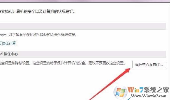 4、在右側(cè)窗口中我們找到Microsoft Word信息中心一項,點擊“信任中心設(shè)置”按鈕,EXCEL也有這個設(shè)置的。