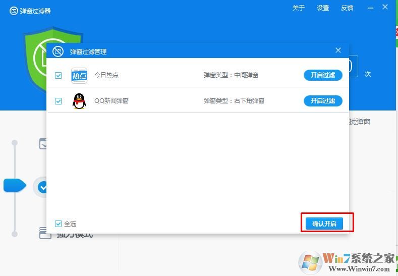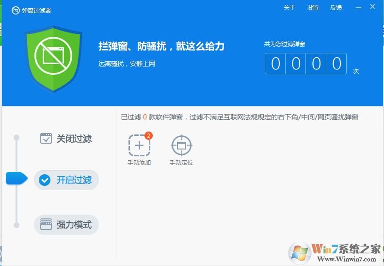3、點擊手動添加,我們會看到一些預(yù)選的彈窗,選擇你不想要的彈窗,點擊開啟即可 如下圖:
