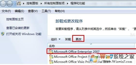 2、在“當(dāng)前安裝的程序”列表中,單擊已安裝的Office 版本,單擊“更改”