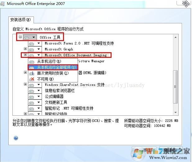 4、展開“Office 工具”,單擊“Microsoft Office Document Imaging”,然后單擊“從本機(jī)運(yùn)行全部程序”,單擊“繼續(xù)”,直至安裝完成。