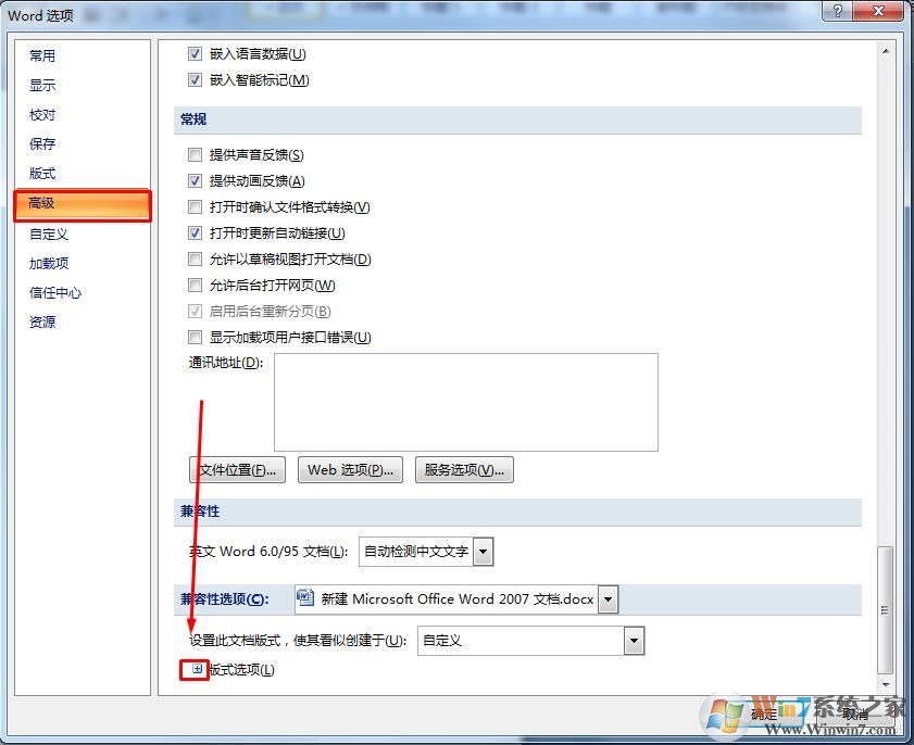2、進(jìn)入Word選項(xiàng),再選擇“高級(jí)”頁面,在右側(cè)把版式選項(xiàng)展開(點(diǎn)+號(hào));