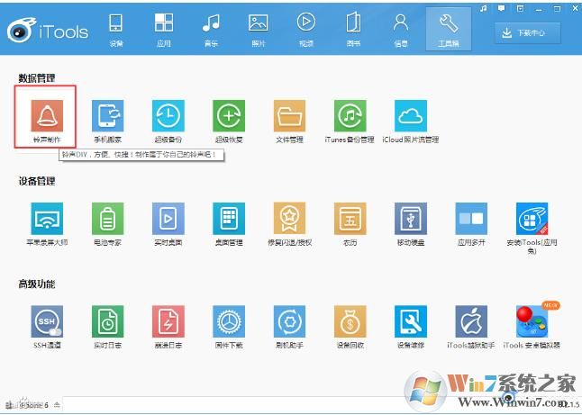 一、安裝iTools(電腦端)后打開 工具箱>>數(shù)據(jù)管理>>鈴聲制作