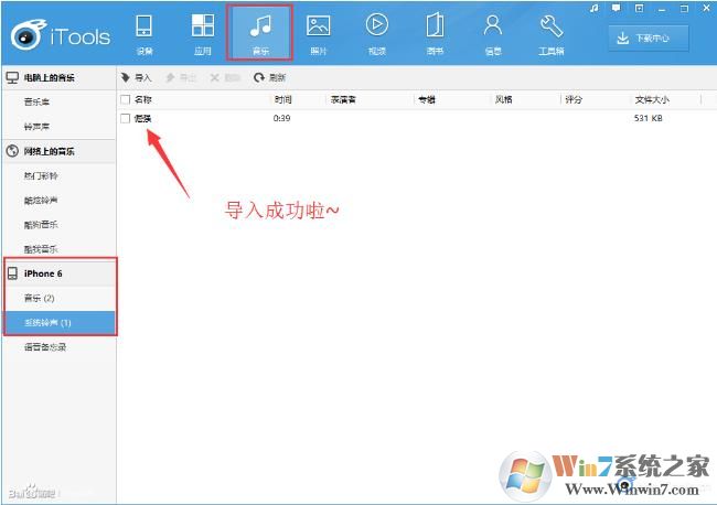一、鈴聲導(dǎo)入成功后,即可在iTools(電腦端)>>音樂>>設(shè)備>>系統(tǒng)鈴聲列表中查看到