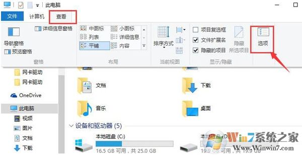 1、進(jìn)入win10系統(tǒng),打開(kāi)此電腦,點(diǎn)擊此電腦窗口頂部“查看”選項(xiàng),然后點(diǎn)擊“選項(xiàng)”圖標(biāo)按鈕,如圖: