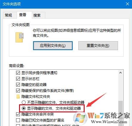 2、彈出文件夾選項(xiàng),在“查看”選項(xiàng)卡下選擇“顯示隱藏的文件、文件夾和驅(qū)動(dòng)器”,設(shè)置好后保存退出即可。如圖: