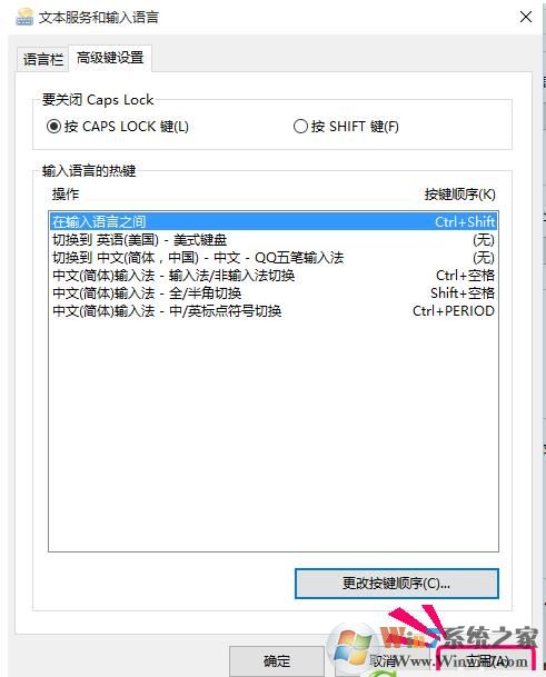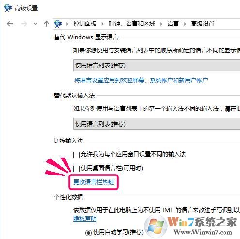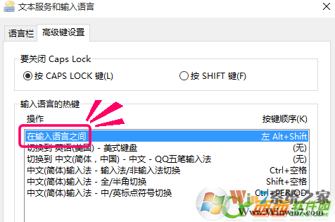 5、然后在[高級(jí)設(shè)置]->[輸入語(yǔ)言的按鍵]一般選擇設(shè)置[在輸入語(yǔ)言之間切換]