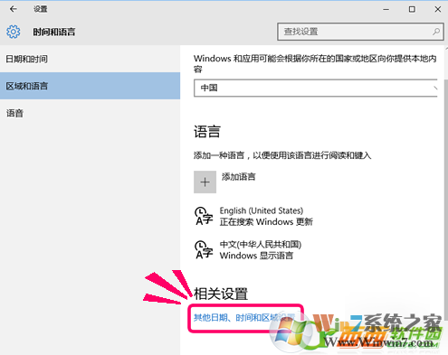 2、打開(kāi)語(yǔ)言設(shè)置首選項(xiàng)后找到相關(guān)設(shè)置下面的[其他日期,時(shí)間和區(qū)域設(shè)置]
