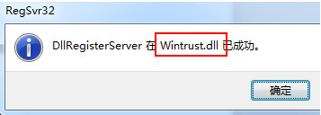 4、之后彈出“DLLRegisterServer在Wintrust.dll已成功”提示窗口,點擊“確定”按鈕繼續(xù),如下圖所示: