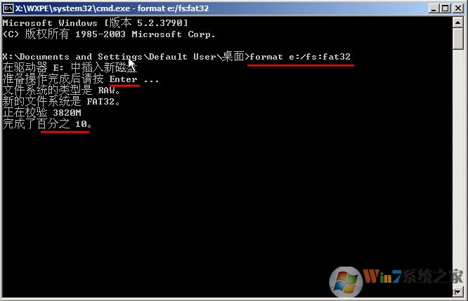 3、在彈出的dos窗口中輸入“format X:/fs:fat32”指令,注:指令中的X是指我們插入u盤的盤符,指令輸入完成后按下回車鍵,這時系統(tǒng)會提醒是否連接了u盤,確認(rèn)連接后再次按下確定,系統(tǒng)開始格式化,如下圖所示