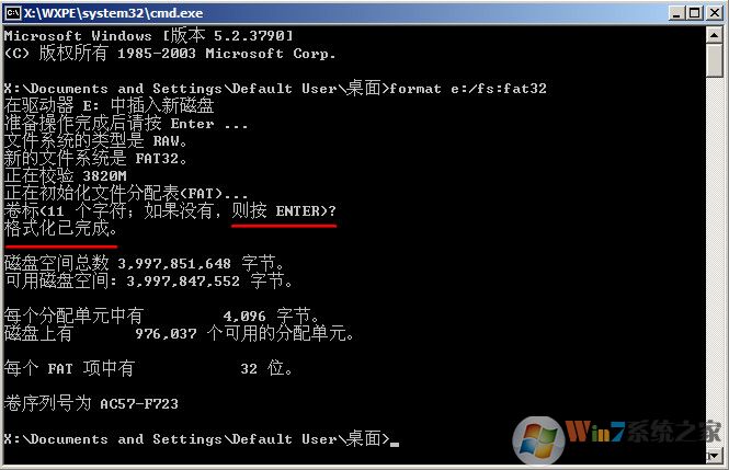 4、u盤格式化一般需要1-3分鐘的時間,當(dāng)完成格式化后,再次按下回車鍵,則格式化完成,如下圖所示