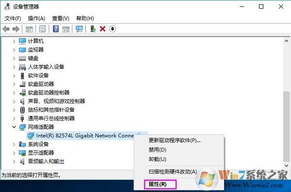 2、在設(shè)備管理器窗口,找到并展開電腦網(wǎng)卡,對著它單擊鼠標(biāo)右鍵,菜單中選擇“屬性”;