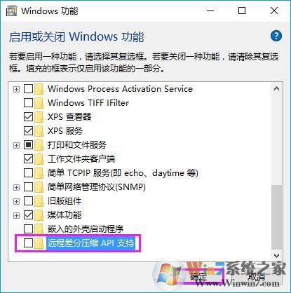 3、在Windows功能窗口,找到“遠(yuǎn)程差分壓縮API支持”,取消前面的勾選后,點(diǎn)擊確定,隨后會出先一個關(guān)閉進(jìn)度提示窗口,別管他,之后需要重啟電腦。