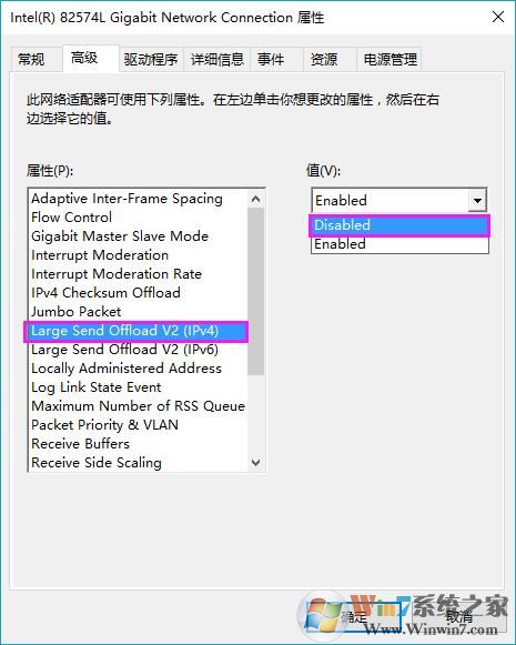 3、在網(wǎng)卡屬性對話框,點(diǎn)擊切換到“高級”選項卡界面,在“屬性”列表中,點(diǎn)擊選中“Large Send Offload v2(IPv4)[大型傳送分載 v2(IPv4)]”,在窗口右側(cè),將“值”設(shè)置為“Disabled(關(guān)閉)”,然后點(diǎn)擊底部確定按鈕。