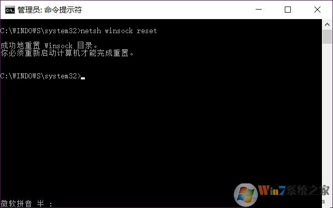 5、如果發(fā)現(xiàn)網(wǎng)頁還是不能登錄,請再來一條命令,輸入netsh winsock reset回車,這個命令可以重新初始化網(wǎng)絡(luò)環(huán)境,包括IP地址、DNS、網(wǎng)卡等等。需要注意,netsh winsock reset輸入完畢后,必須重啟一次電腦。