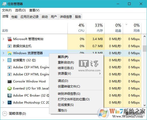 你可以在任務管理器中找到資源管理器,右鍵單擊選擇“重新啟動”,如下圖所示: