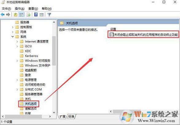 2、調出本地組策略編輯器窗口后,依次展開:計算機配置→管理模板→系統(tǒng)→關機選項,然后在右側找到“關閉會阻止或取消關機的應用程序的自動終止功能”并雙擊將其打開,如圖所示:
