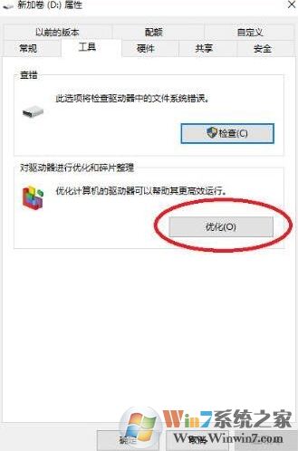 2、在彈出的屬性窗口中,點擊“工具”選項卡,找到“對驅(qū)動器進行優(yōu)化和碎片整理”項目”并點擊“優(yōu)化”,如下圖所示: