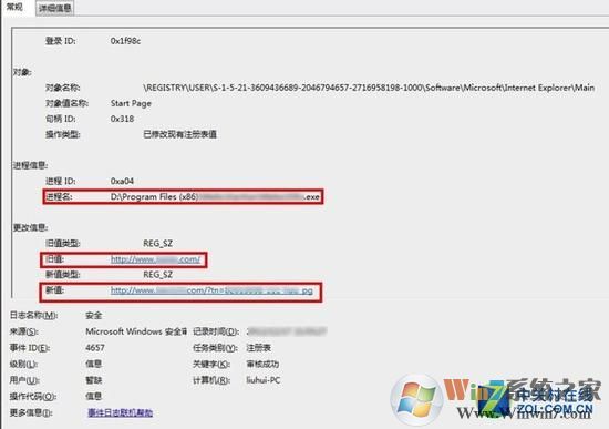 也就是說,當注冊表值被修改時,修改的明細就可以在新建的事件記錄中了。如果已經有信息記錄的話,那我們需要點擊該記錄,然后在常規(guī)中能夠看到進程信息,包括進程名的位置、修改前的主頁和修改后的主頁。