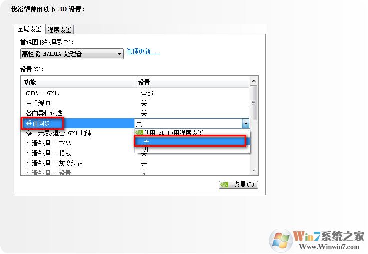 5、然后調(diào)整本機的“垂直同步”選項為“關(guān)”,如下圖所示: