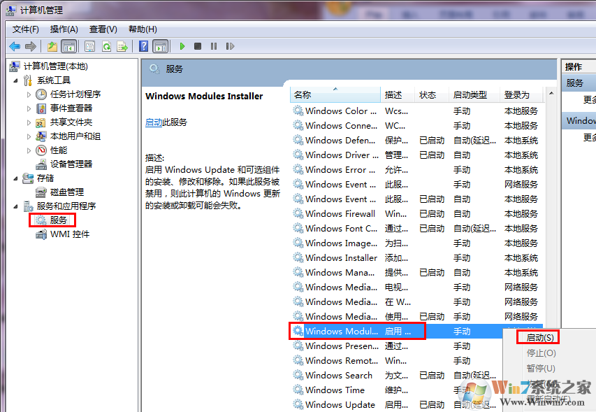 計(jì)算機(jī)右擊管理,打開服務(wù),檢查Windows Modules Installer服務(wù)是否開啟,如果服務(wù)狀態(tài)為停止,則啟用此服務(wù)。