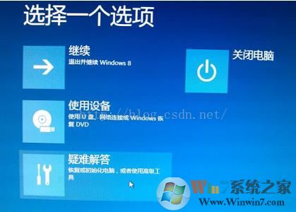 按住Shift不放 ,點(diǎn)開始菜單,選擇重啟,過一會進(jìn)入如下界面(網(wǎng)上的圖片,WIN10差不多),選擇 “疑難解答”: