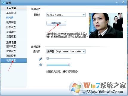 5、點擊畫質調節(jié)后你將會看到如下界面,在這里你可以調節(jié)比如亮度對比度等畫面顯示的參數(shù)。你可以根據(jù)自己環(huán)境選擇最清晰的畫面。防閃爍建議調到最大。這個界面的設置跟攝像頭產品有關,不多調節(jié)參數(shù)都是大同小異。還有很多細節(jié)可以適當進行調整,設置完成后點擊確定,這樣攝像頭就設置完成了。接下來你就可以和你的好友視頻聊天了。