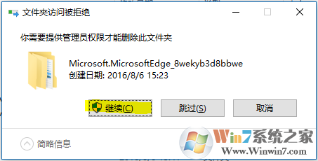 5、使用鼠標(biāo)雙擊打開這個(gè)Microsoft.MicrosoftEdge_8wekyb3d8bbwe文件夾,選中里面的所有內(nèi)容,并刪除它們,當(dāng)有權(quán)限提醒時(shí),請(qǐng)點(diǎn)擊“繼續(xù)”,直到無(wú)法點(diǎn)擊繼續(xù)后,點(diǎn)擊取消,此時(shí)應(yīng)該會(huì)只剩下AC這一個(gè)文件夾在里面,這個(gè)無(wú)傷大雅,如圖: