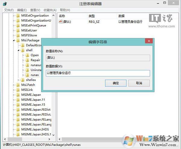 4、在runas項(xiàng)右側(cè),更改默認(rèn)字符串,為“以管理員身份運(yùn)行”值