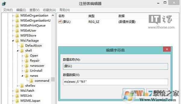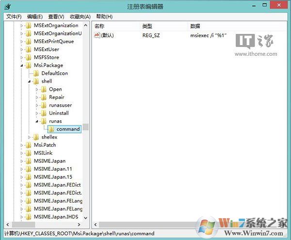 5、在shell下,繼續(xù)新建“command”項(xiàng),更改默認(rèn)字符串為msiexec /i“%1”