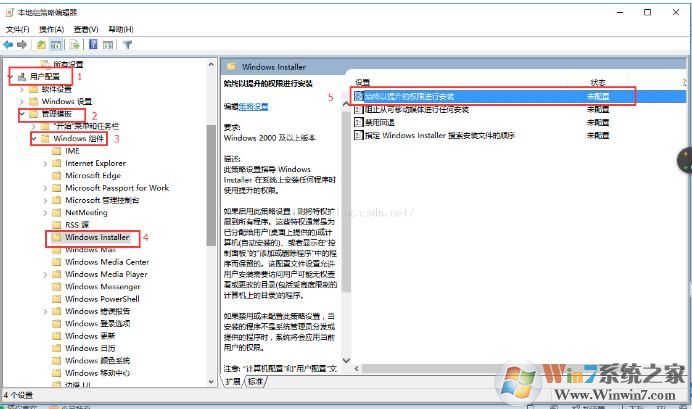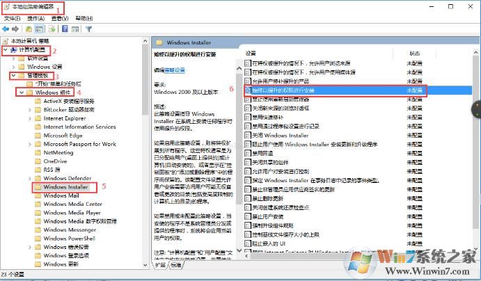 2、打開本地策略組編輯器后依次展開 :“計算機配置”->“管理模板”->"windows組件"->“windows installer”,并找到“始終以提升的權(quán)限進行安裝”;