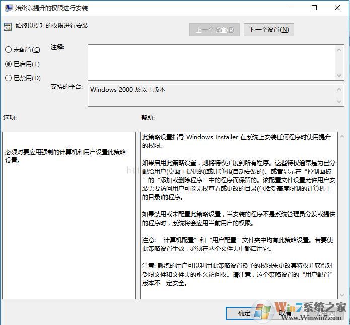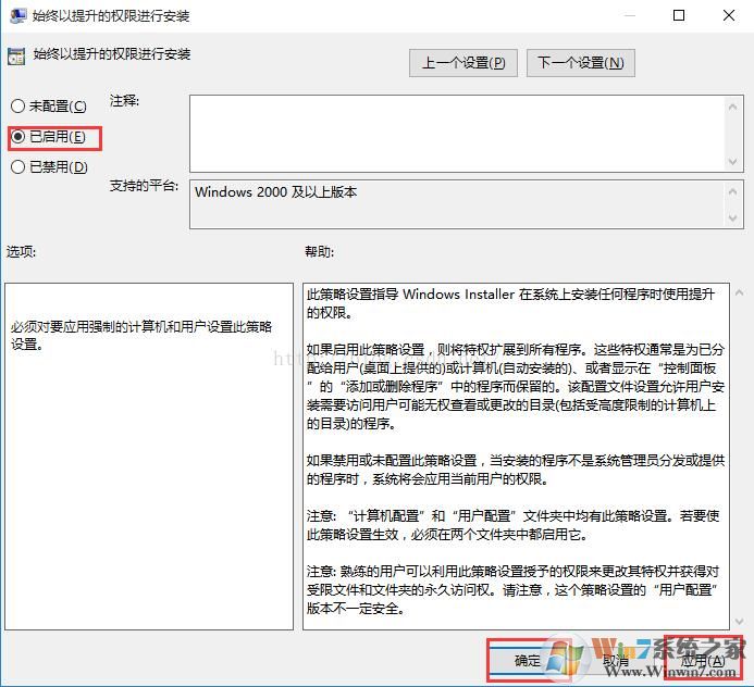 3、雙擊該選項,設(shè)置為“已啟用”,并應(yīng)用,如下圖;
