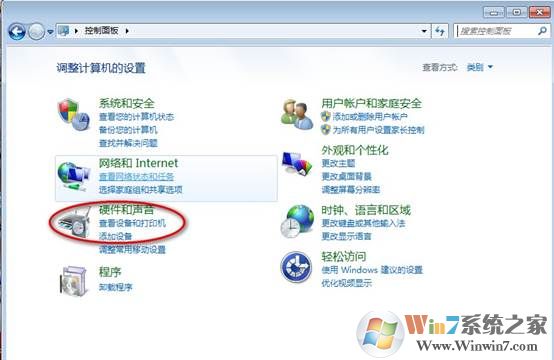 1、打開控制面板,選擇“硬件和聲音”;