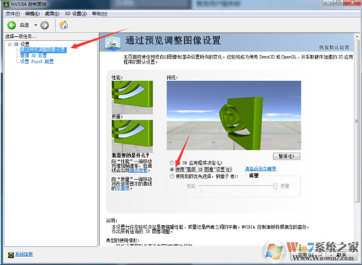 在彈出的新窗口中使用鼠標左擊“通過預覽調整圖像設置”,然后選擇:使用高級3D圖像設置,修改好后點應用。