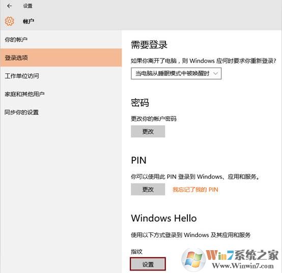 6、上述操作完成后,可以看到Windwos Hello中指紋出現(xiàn)“設(shè)置”按鈕可以點(diǎn)擊;