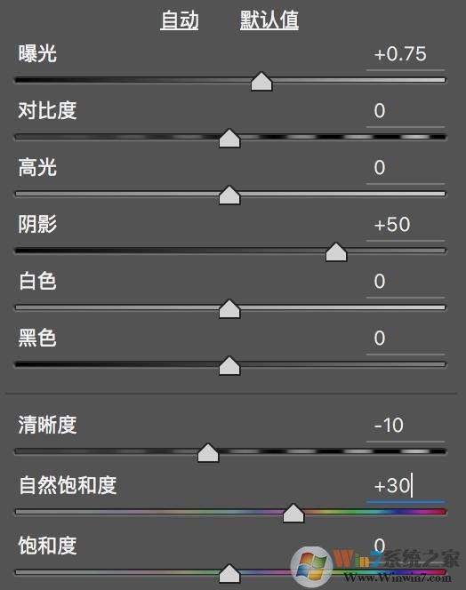 美食照片最好要鮮亮一些,所以之后我來調(diào)整照片的曝光表現(xiàn)。在色溫、色調(diào)下面就是曝光滑塊的調(diào)整。