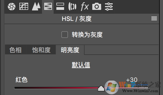 之后,我進(jìn)入“HSL/灰度”面板中,將紅色的明亮度提升到+30,這樣右上方的魚肉看上去會更亮。
