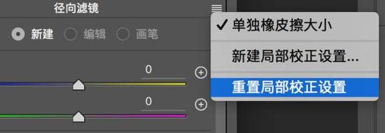 現(xiàn)在徑向?yàn)V鏡已經(jīng)有一些參數(shù),所以我先點(diǎn)擊“徑向?yàn)V鏡”字樣旁邊的菜單,選擇“重置局部校正參數(shù)”,這時候所有參數(shù)會回到默認(rèn)值。