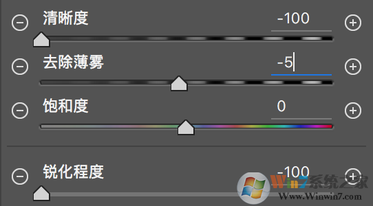 我將清晰度、銳化程度調(diào)整為-100,然后把去除薄霧設(shè)置為-5,來柔化邊緣邊緣的照片表現(xiàn)。